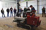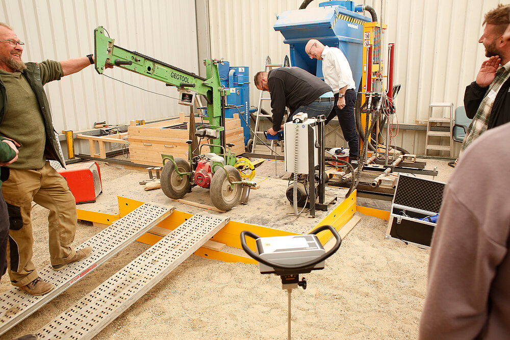 Gerald Verbeek von Eijkelkamp eröffnete den fachlichen Teil mit einer theoretischen Einführung. Anschließend demonstrierte er mit einem Kollegen das Verfahren mit einer kompakten Sondierraupe in der Versuchshalle des GeoTechnikums. Ein besonderes Highlight war ein innovatives Video-Modul, das während der Sondierung hochauflösende Aufnahmen aus dem Untergrund lieferte. So konnten die Teilnehmenden von der Oberfläche aus direkt in den Untergrund blicken.