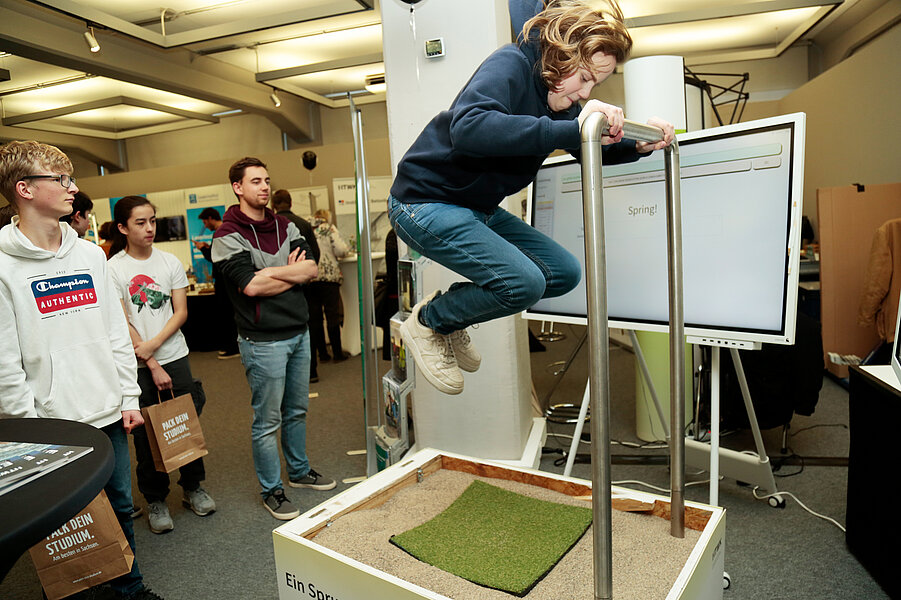 Im Foyer des Nieper-Baus (Karl-Liebknecht-Straße 134) gibt es Mitmachstationen und Exponate zum Anfassen und Ausprobieren: Einige davon befassen sich mit nachhaltigen Materialien wie Carbonbeton und Holz. So können Besucherinnen und Besucher beispielsweise ausprobieren, wie sie Beton zum Leuchten bringen oder wie digitaler Holzbau von Morgen mit Augmented Reality funktioniert. Den Kreislauf in Schwung bringt das bikelab: Hier können Gäste beim Fahrradfahren nicht nur Belastungen testen, sondern gleichzeitig Strom erzeugen. Oder sie finden beim interaktiven Sandkasten der Geotechnik heraus, ob ihr Sprung der eines Handstampfers oder doch einer schweren Impulsverdichtung gleicht. Viele Roboter sind in der 1. Etage zu finden: Die HTWK Robots präsentieren die neue Generation des Roboterfußballs, und nebenan wartet ein interaktives Tic-Tac-Toe-Spiel gegen einen superschnellen Scara-Roboter.