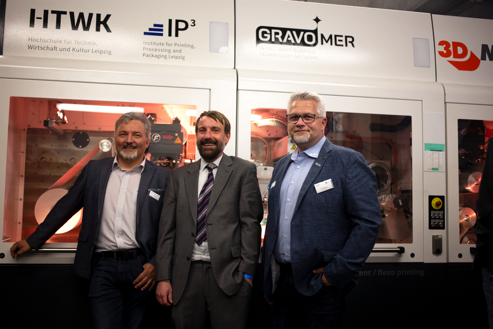 Das Kompetenzzentrum ist eine Symbiose aus dem GRAVOmer-Netzwerk sowie drei zur HTWK Leipzig gehörenden Bereichen: dem iP³ Leipzig – Institute for Printing, Processing and Packaging Leipzig, dem Mathematisch-Naturwissenschaftlichen Zentrum und dem Kompetenzzentrum für Werkstoffforschung, so iP³-Institutsleiter Prof. Dr. Lutz Engisch. Viele Schritte aus der alten Welt der Druck- und Verpackungstechnik seien bekannt, nun können sie mit dem Zentrum ins Heute übertragen werden. Dazu beitragen wird auch die neue Beschichtungsanlage, mit der künftig neue Ideen in Bildung, Wissenschaft und Entwicklung implementiert werden können. „Wir machen damit einen weiteren Schritt in Richtung Fortschritt“, fasst Prof. Dr. Swantje Rother, Kanzlerin der HTWK Leipzig, die Einweihung zusammen. Fortschritt entstehe an Schnittstellen, an denen wie an der HTWK Leipzig interdisziplinär ausgebildet und geforscht werde.