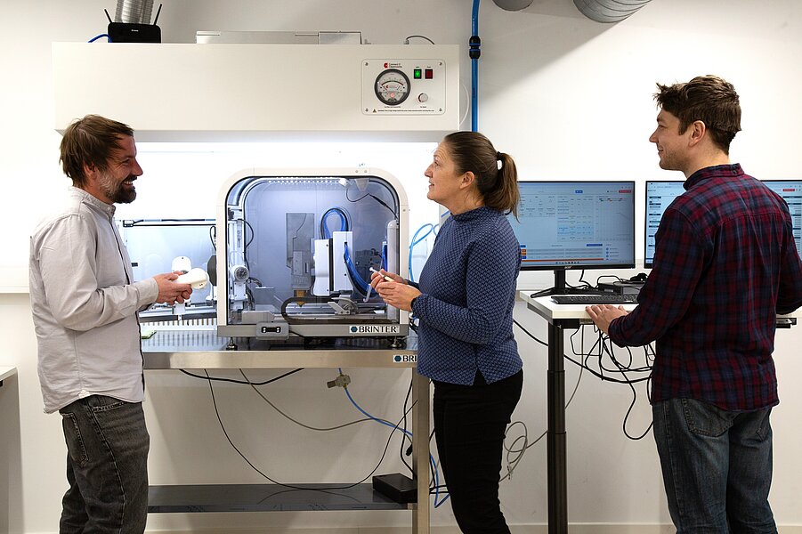 Bereits seit dem Frühjahr 2025 ist eine Pulverscherzelle von Anton Paar samt Klimakammer an einem Präzisionsrheometer im Einsatz. Mit dieser können Forschende Fließeigenschaften von Pulvern in einer kontrollierten Temperatur- und Feuchteumgebung bestimmen und so den Pulverauftrag im 3D-Druck optimieren und funktionale Materialverbünde und Bauteile entwickeln. Im Herbst 2025 nahmen die Forschenden den hochmoderne Polymer-3D-Drucker „Voxeljet VX200 HSS“ in Betrieb, mit dem sie neue Materialien und Verfahren entwickeln sowie schnell und flexibel Prototypen oder Kleinstserienbauteile zu Forschungszwecken herstellen können.
