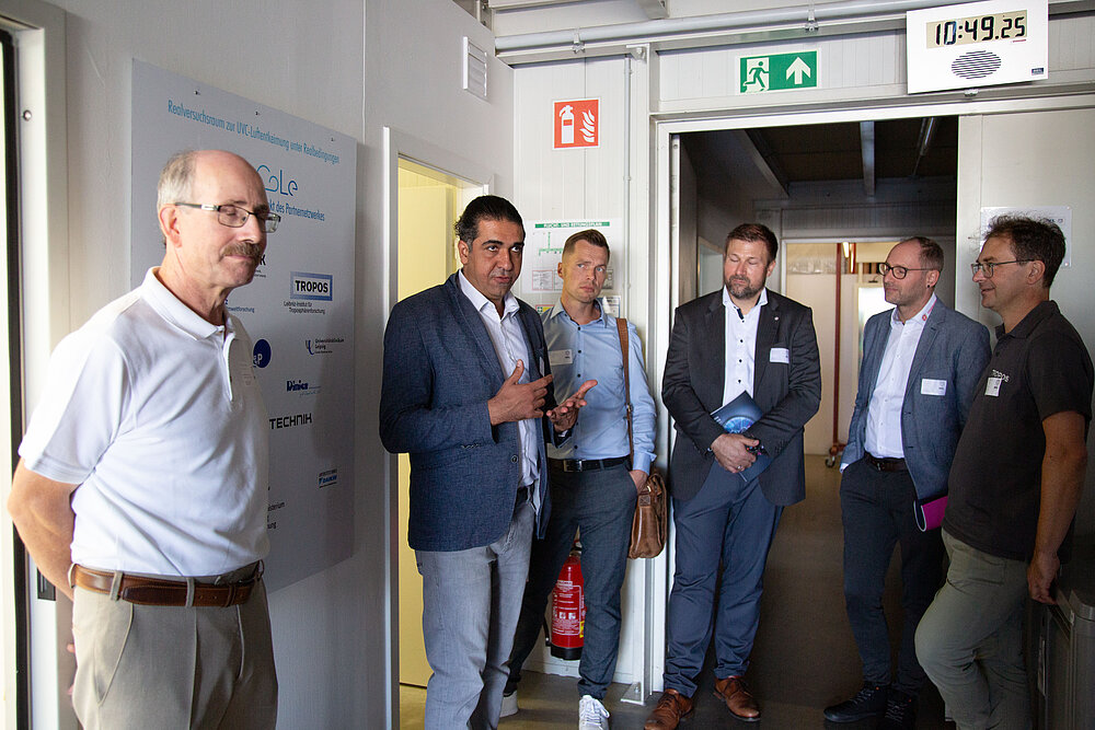 Im Mittelpunkt der Veranstaltung stand die Besichtigung des neu geschaffenen Reallabors: Ein eigens eingerichtetes Klassenzimmer ermöglicht dort die praxisnahe Erprobung verschiedener UV-C-Bestrahlungstechnologien. In geführten Rundgängen erhielten die Gäste detaillierte Einblicke in technische Ausstattung, laufende Testreihen und wissenschaftliche Fragestellungen. Dabei ergaben sich zahlreiche Möglichkeiten zum direkten Austausch mit den Forschenden.
