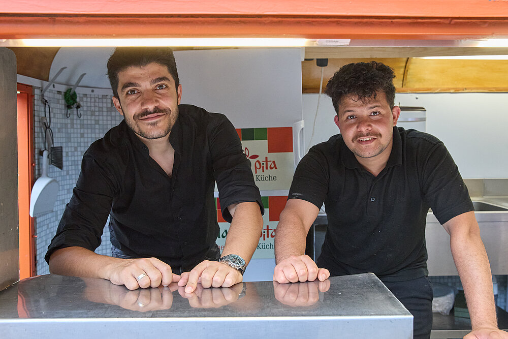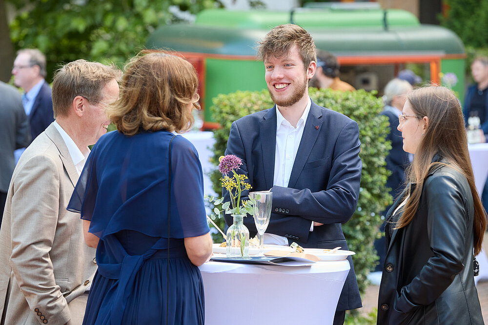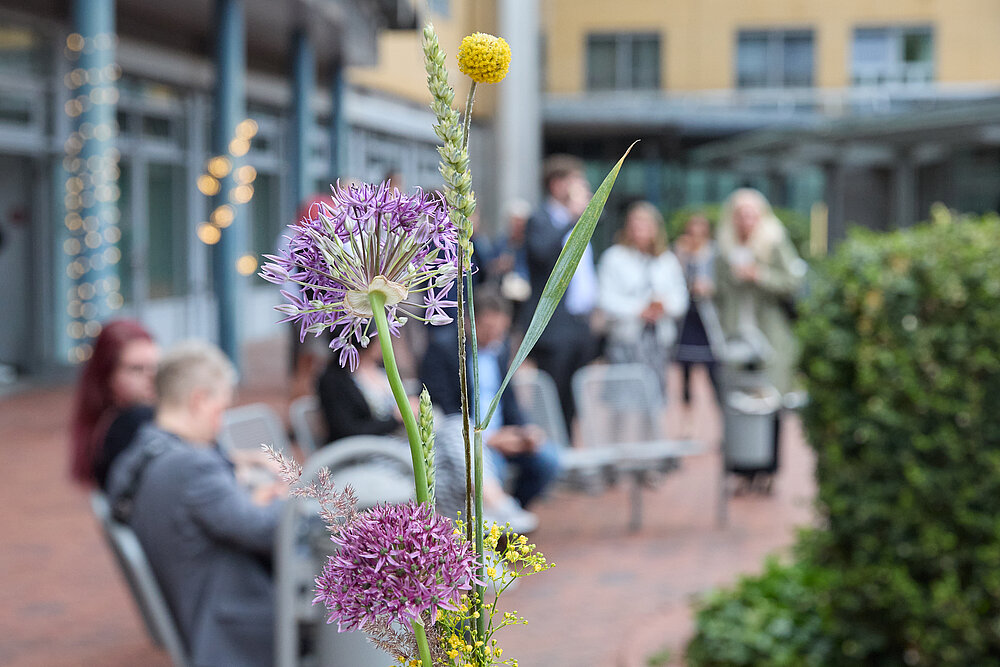 Dank des guten Wetters konnte anschließend im Innenhof weitergefeiert werden. Es gab syrisches Essen von Maza Pita direkt aus dem Foodtruck und kühle Getränke, die durch Studierende der Matrikel 21 mit freundlicher Unterstützung des Studi-Clubs Eichamt 14 ausgereicht wurden.