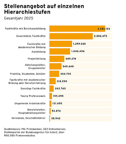 Grenz: Unternehmen suchen deutlich mehr Fachkräfte mit Ausbildung und Berufserfahrung als Akademiker. 2025 konnten sich klassische Fachkräfte bundesweit auf fast 3,4 Millionen Positionen bewerben. Für Akademiker waren es lediglich rund 1,6 Millionen Stellen. Zudem sind den Unternehmen auch Nachwuchskräfte sehr wichtig. Für Praktikanten und Werkstudierende stieg das Stellenangebot im Jahresvergleich um 4 Prozent. Die Anzeigenschaltung für Young Professionals, also Hochschulabsolventen mit maximal drei Jahren Berufserfahrung, legte um 3 Prozent zu.