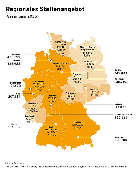 Grenz: Kaum. Mit rund 2,1 Millionen öffentlich ausgeschriebenen Stellen gab es die meisten Jobchancen im bevölkerungsreichsten Bundesland Nordrhein-Westfalen. Auf den Plätzen zwei und drei folgten Bayern mit rund 1,8 Millionen Stellen und Baden-Württemberg mit fast 1,5 Millionen Stellen. Unter den neuen Bundesländern führte Sachsen mit nahezu 517.000 Stellen. Leipzig war mit fast 114.000 Stellen die ostdeutsche Jobhochburg. Prozentual sank das Stellenangebot 2025 verglichen mit 2024 in allen Bundesländern bis auf eine Ausnahme. Berlin verzeichnete ein moderates Plus von 2 Prozent.